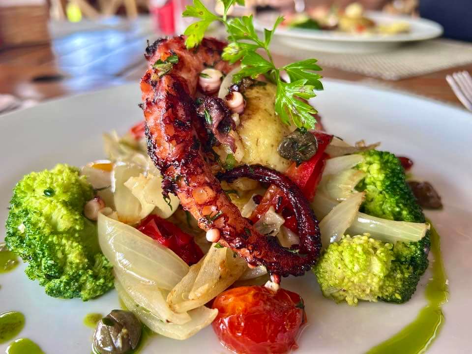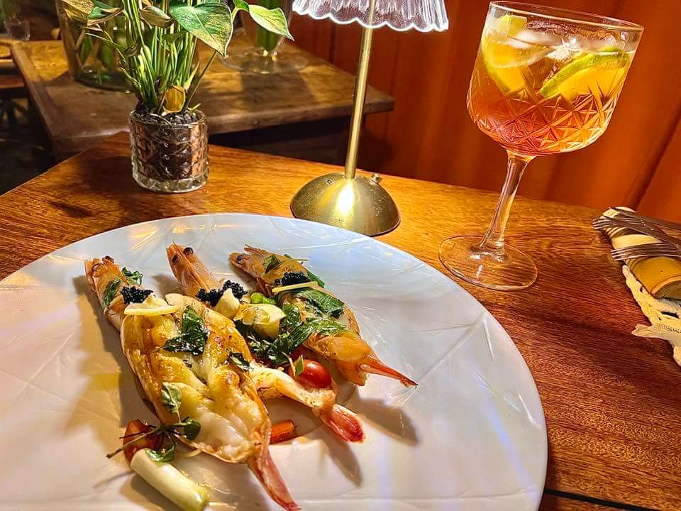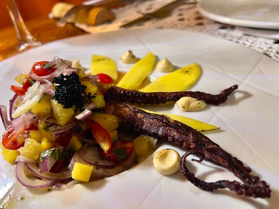 De entradas, são várias as opções deliciosas. Entre elas, couvert com seleção de pães da casa, creme de grão de bico, manteiga com flor de sal e queijo cremoso com tapenade de azeitonas; queijo brie morno assado com casquinha crocante, servido com melado de cana e pera com especiarias; crudo de salmão maçaricado, vem com cubos de tangerina e manga, cebola roxa e tomatinhos da horta, regados com azeite extra virgem. Fomos de camarões inteiros grelhados no azeite, e de polvo ao vinagrete que são de comer re-zan-do!