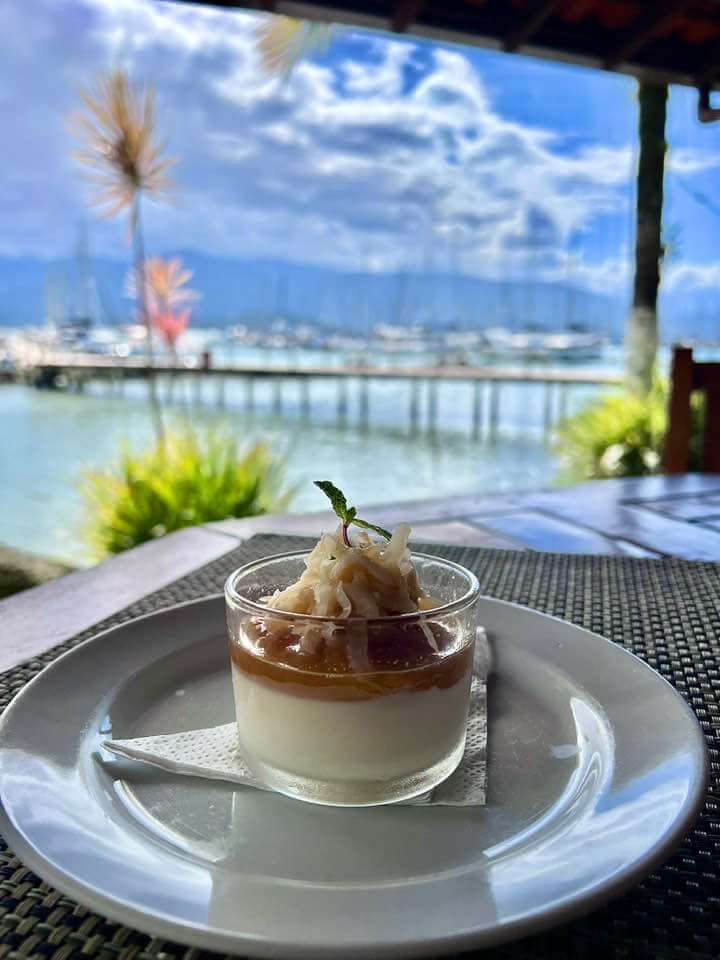 O lugar é lindo, tem estacionamento, e uma vista daquelas de cinema. Muitas embarcações ancoradas, o mar em volta e a serra da Bocaina o fundo, sem esquecer do centro histórico que deixa tudo ainda mais belo. O restaurante dispõe de 12 mesas com capacidade para acomodar até 60 pessoas, nos ambientes interno e externo. É uma delícia estar na varanda, há ainda sofás, poltronas e um jardim lindo pra gente relaxar.
