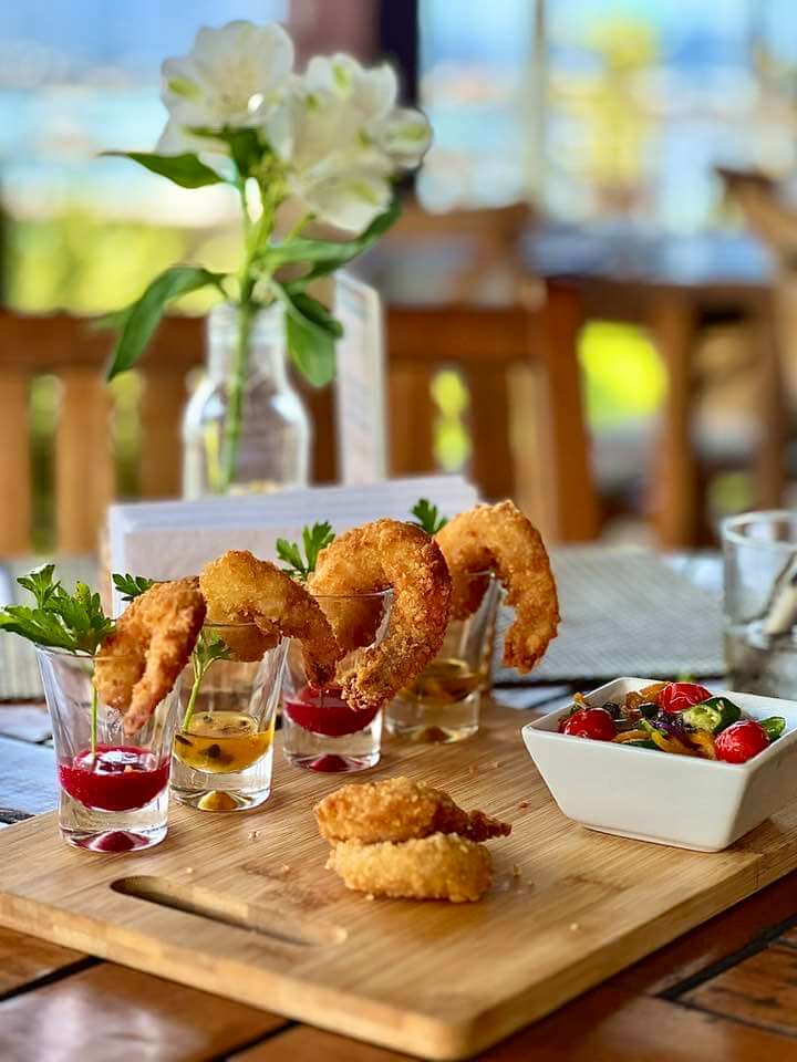 Das opções de entrada, casquinha de siri gratinada, ceviche de robalo, camarões crocantes, fomos neste último e estava divino! E de principal, filé de robalo, bacalhau, linguini com camarão e parma, risoto de camarão, polvo grelhado, também provamos este último e é simplesmente maravilhoso. Tem ainda bobó de camarão, medalhão de filé e a casa também dispõe de cardápio kids.
