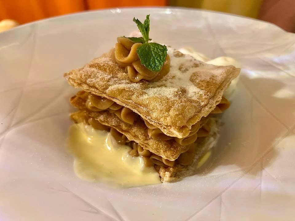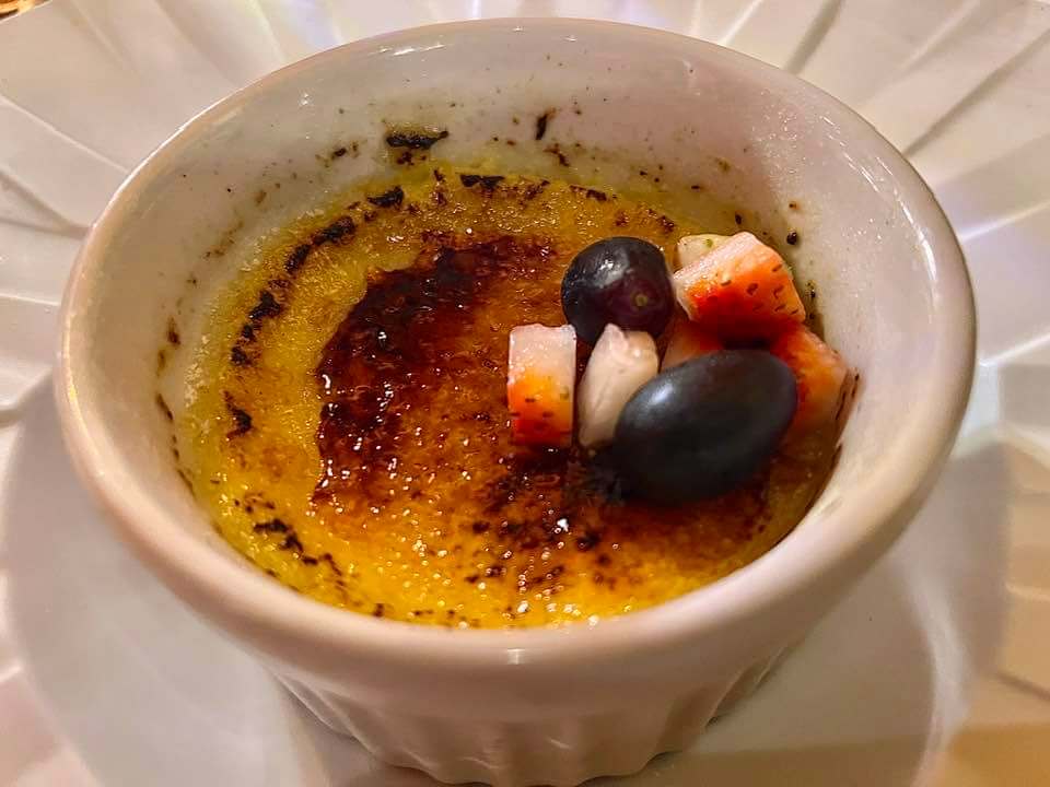 Fomos de creme brülée e estava maravilhoso, mas tem também mil folhas de doce de leite, camadas de massa folhada intercalada com doce de leite de Minas Gerais, servido com geladinho de baunilha deitado em creme inglês; ganache de chocolate belga servido co frutas vermelhas da estação; e ainda profiterole, carolinas recheadas com sorvete de baunilha e calda de chocolate.